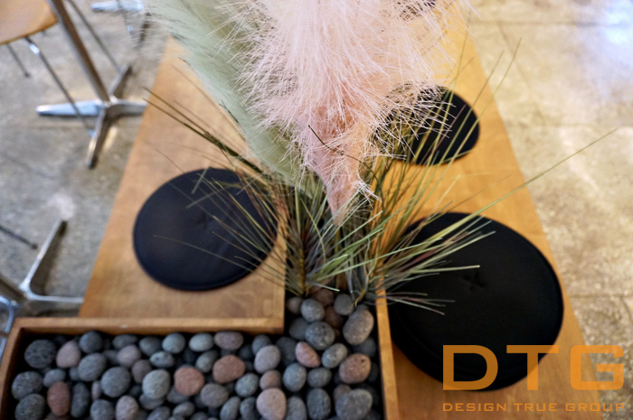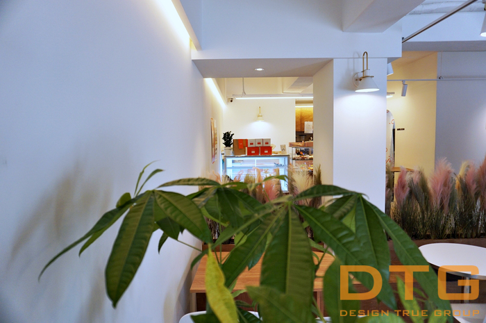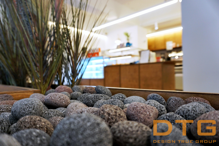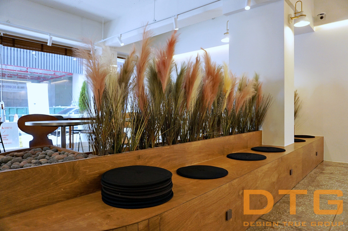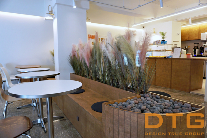 우드를 기본으로 , 카운터&쇼케이스 와 중앙 붙박이의자, 중앙 파티션 플랜트를 접목하여,
