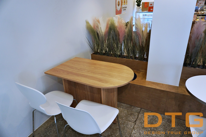 우드를 기본으로 , 카운터&쇼케이스 와 중앙 붙박이의자, 중앙 파티션 플랜트를 접목하여,