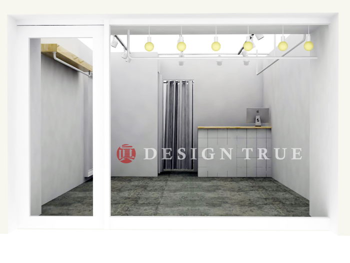 화이트와 오크컬의 조합인 벽체와 , 노출콘크리트 의 에폭시 처리된 바닥으로 의상컨셉 극대화 연출.
