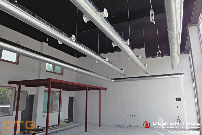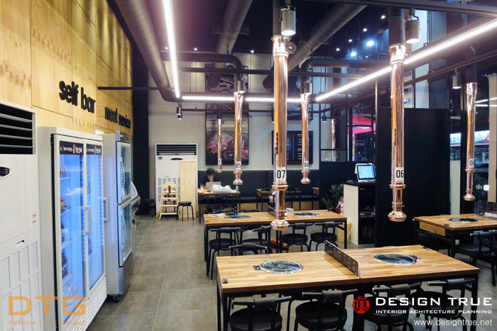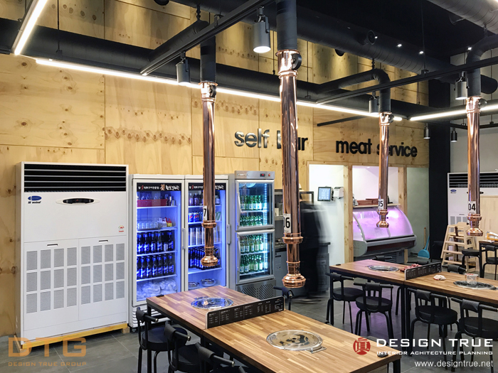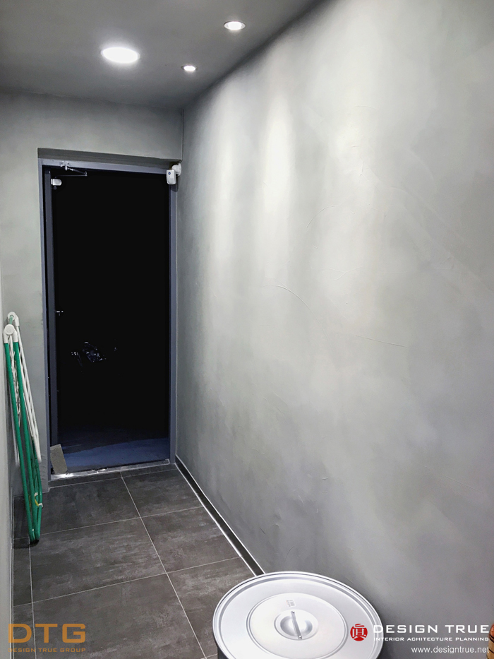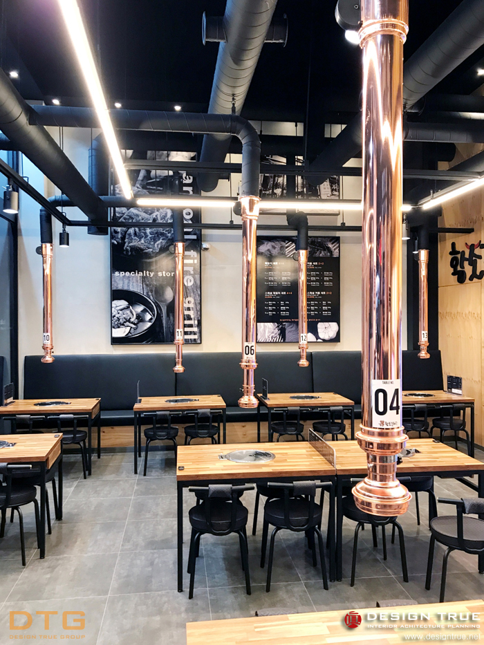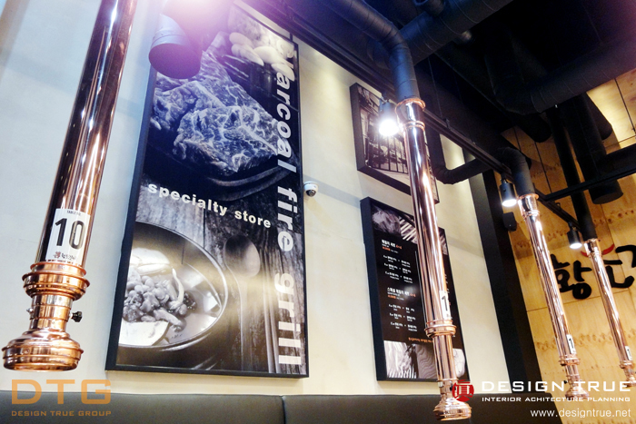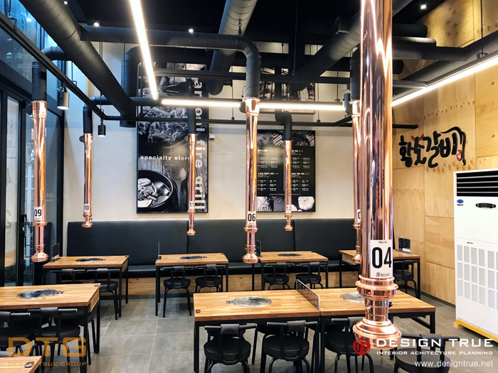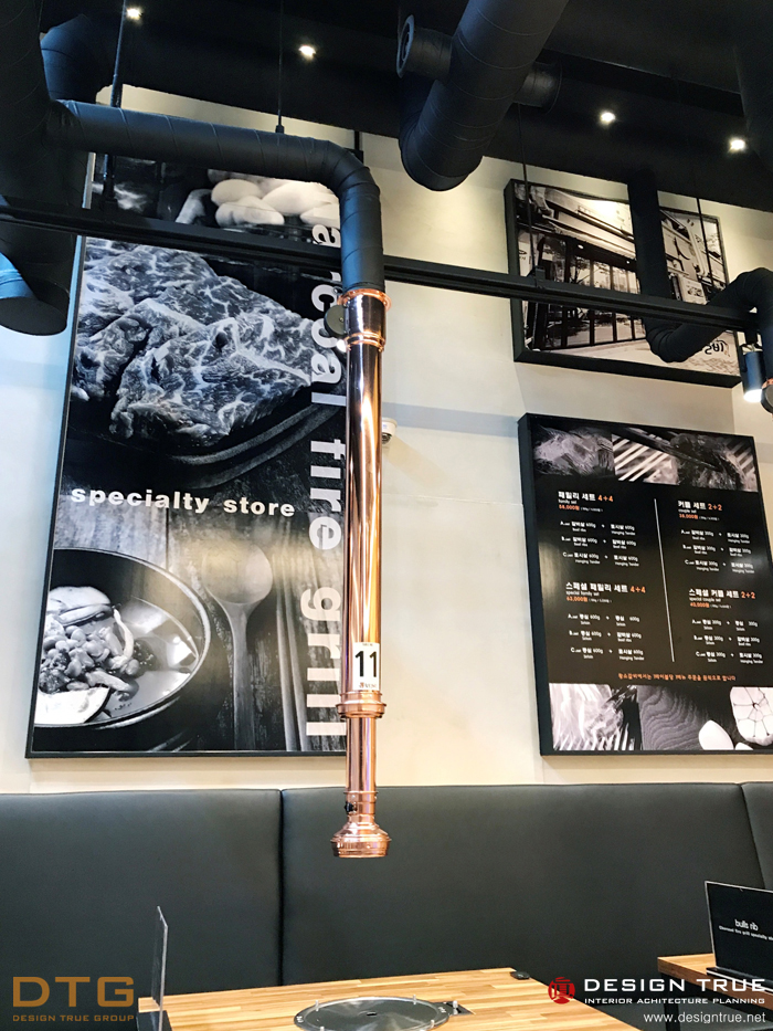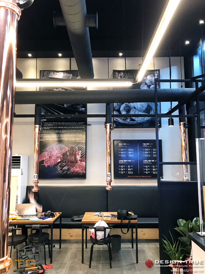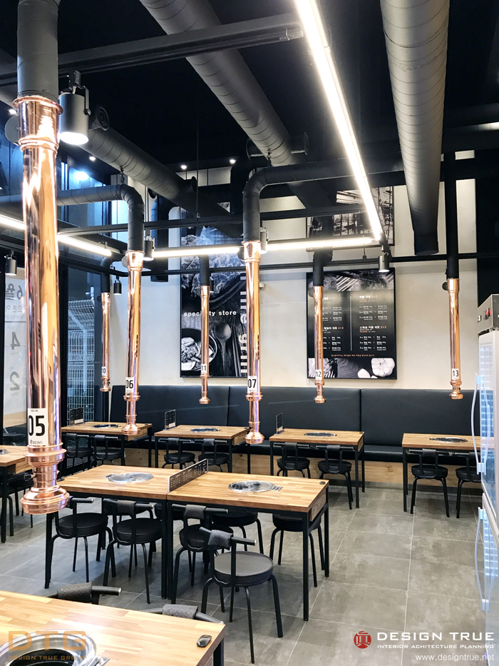 그레이(회색) 계열의 회벽과 블랙의 노출천장으로 무개감을 강조, 실사 의 입체를 통하여 개성적이며,