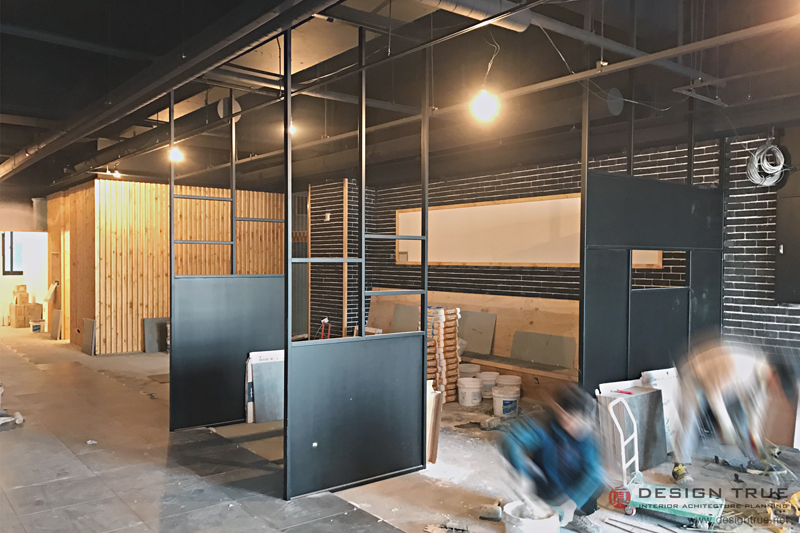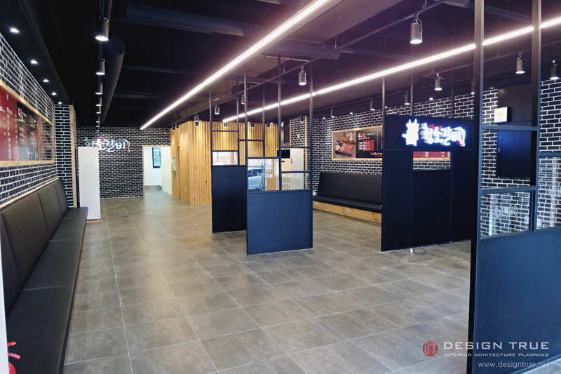 다크 그레이 파벽석과 블랙의 노출천장으로 무개감을 강조,